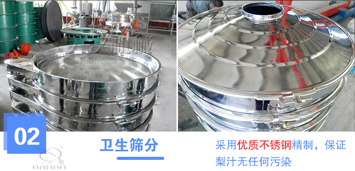不銹鋼振動篩的篩分精度非常高,細可達0.028mm(500目),適用于各種液體和超微細粉末的篩分,可以保證梨汁的精準篩分、過濾、除雜,同時篩網可以安裝1-5層,篩分出六種不同粒度規格的的梨汁,保證了梨汁的口感,能夠適用于客戶不同的需求,功能非常強大。