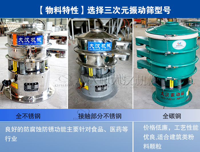 您可根據物料特性主要是決定您是適用哪種材質的三次元振動篩