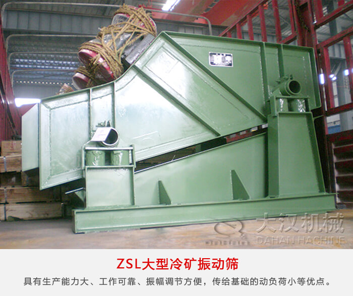 ZSL系列大型采用雙軸激振器,電機不參振,由兩臺電機外拖作反向自同步旋轉,使篩箱產生較大振幅沿直線方向作周期性往復運動,從而達到篩分目的的一種振動篩設備。這種振動篩具有生產能力大、工作可靠、振幅調節方便、傳給基礎的動負荷小等優點。