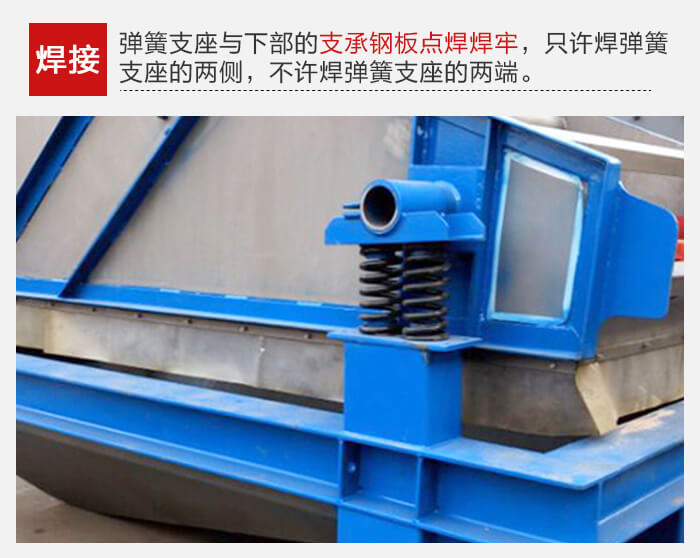 振動器各部分安裝完畢,調整好相對位置,各處的一次、二次隔振動彈簧均呈垂直狀態后,把彈簧支座與下部的支承鋼板點焊焊牢。焊接時,只許焊彈簧支座的兩側,不許焊彈簧支座的兩端。