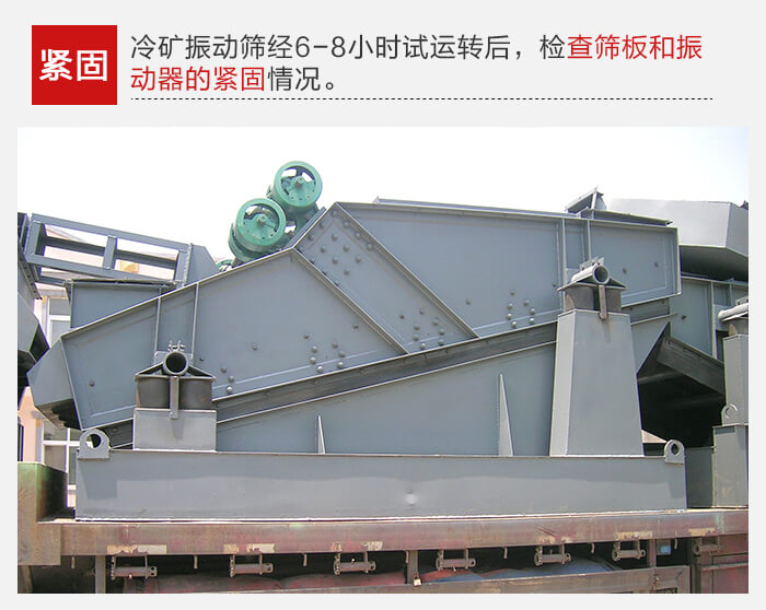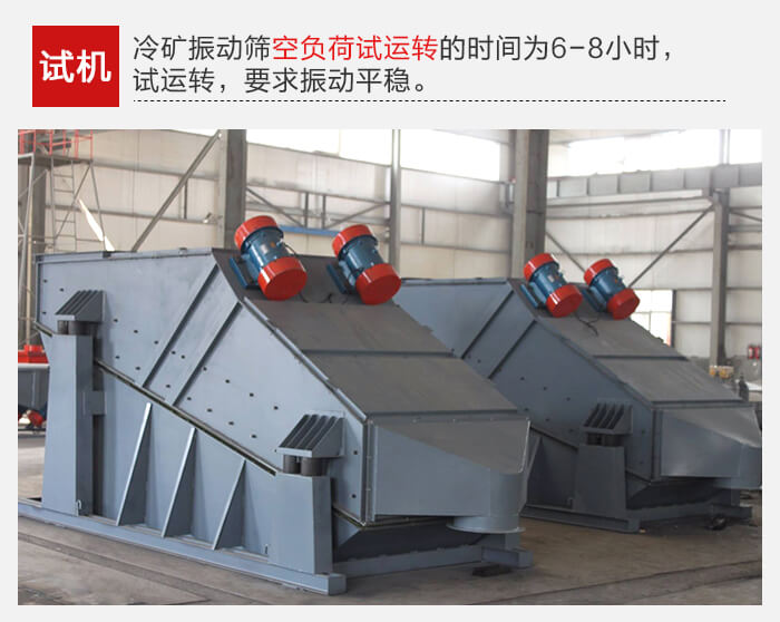 冷礦振動篩經6-8小時試運轉后,應檢查篩板和振動器的緊固情況,如發現松動應及時擰緊,振動器軸承工作溫度應75℃。